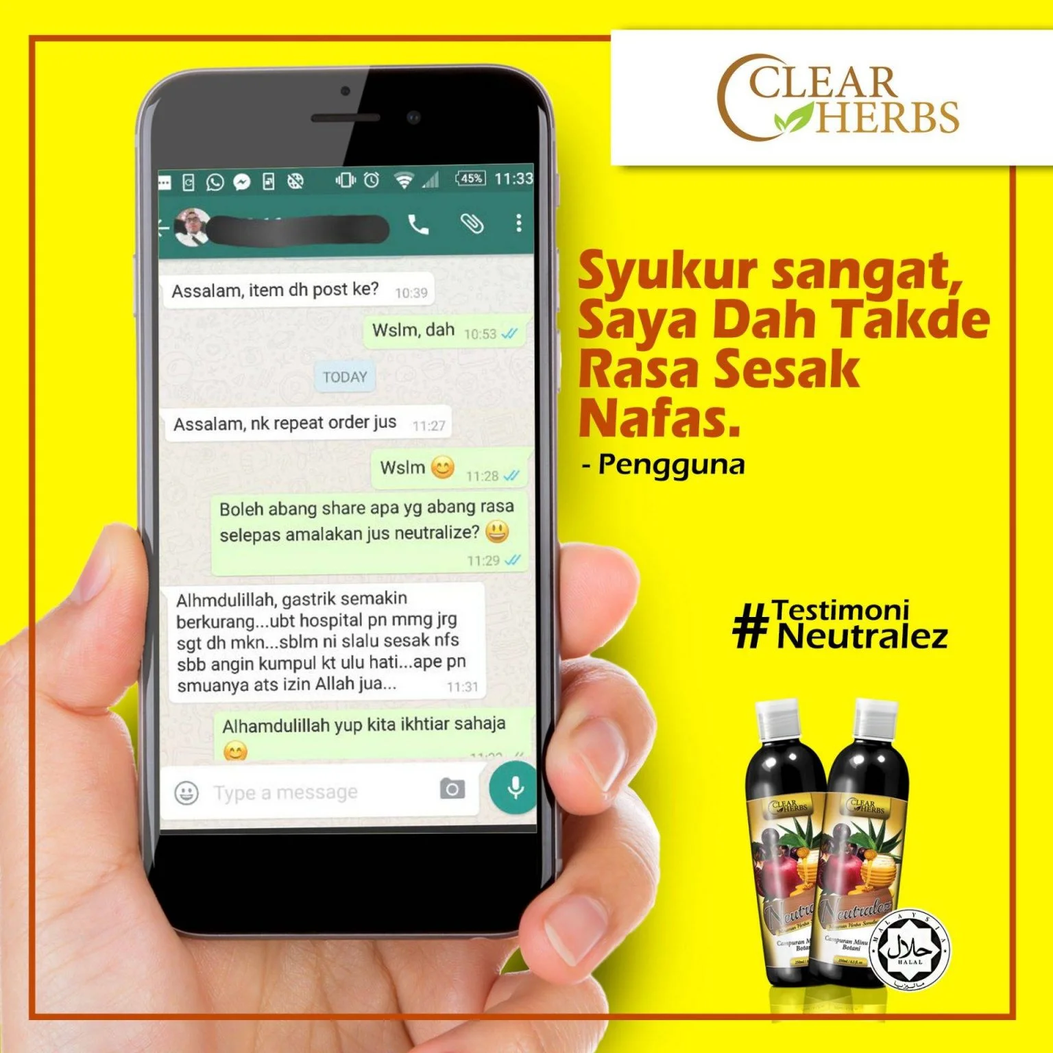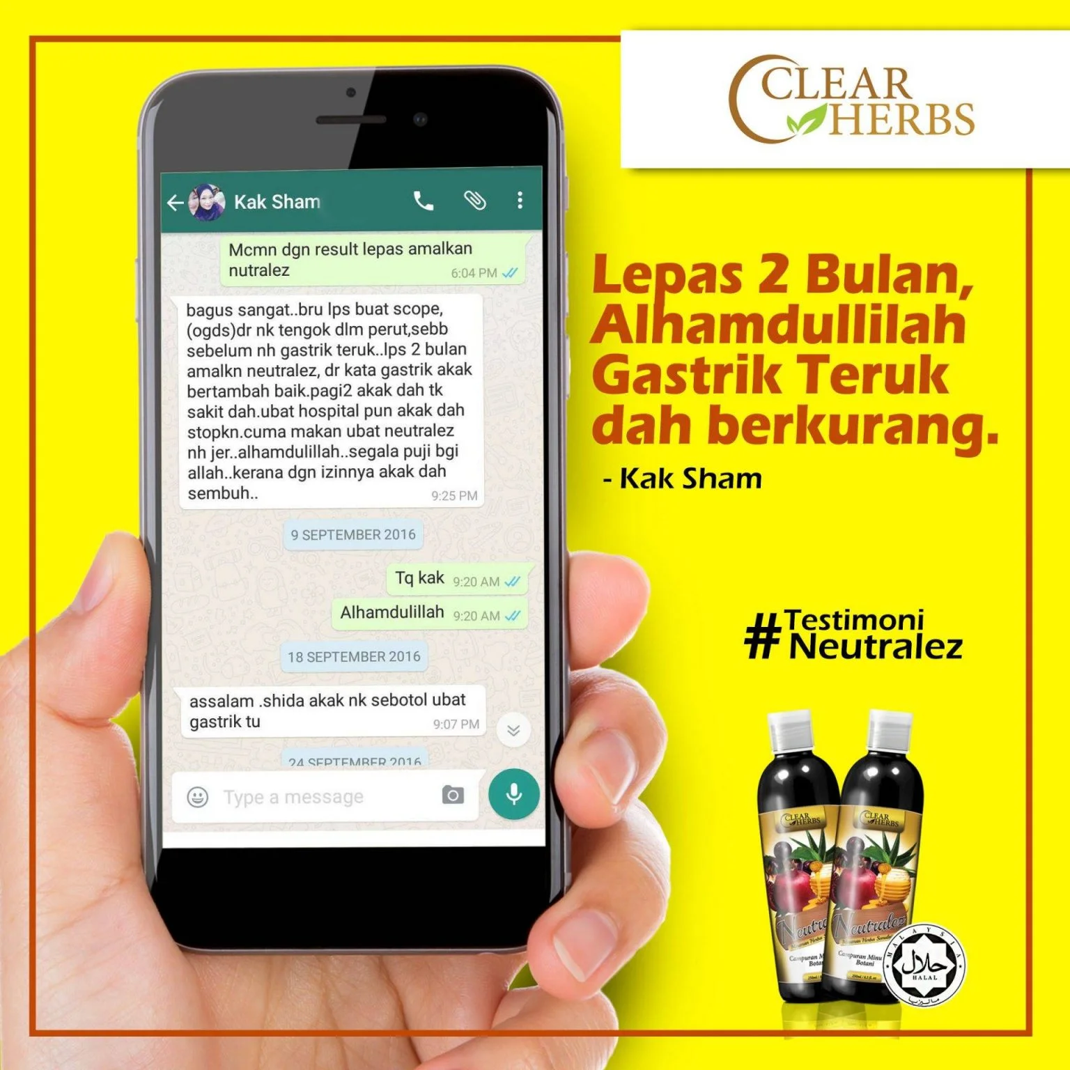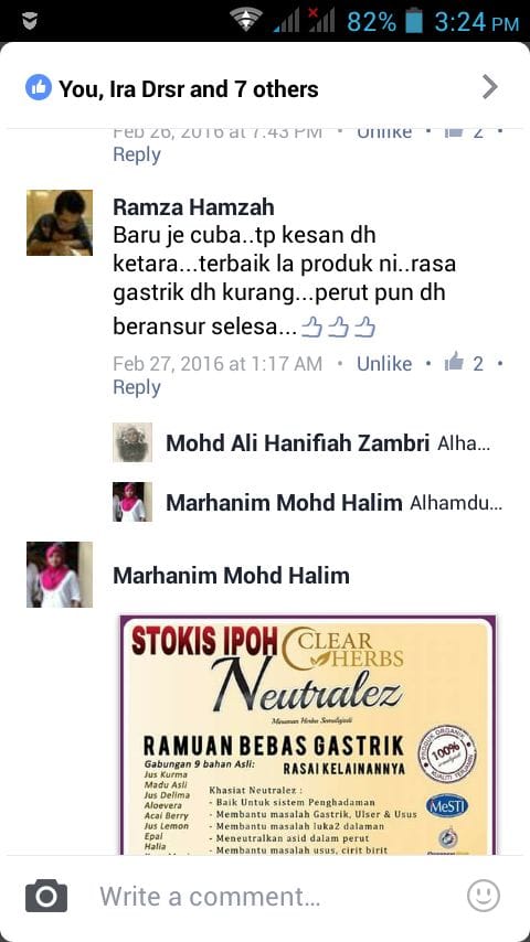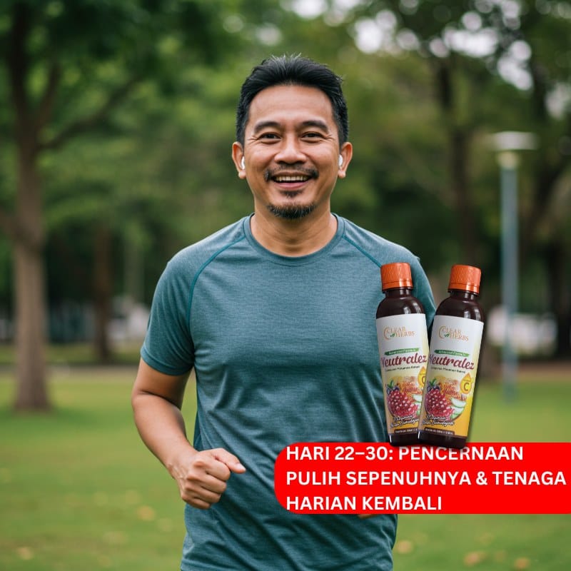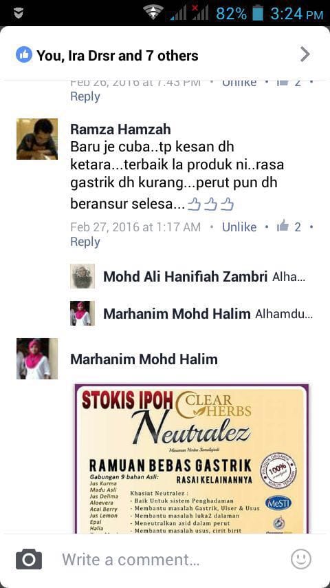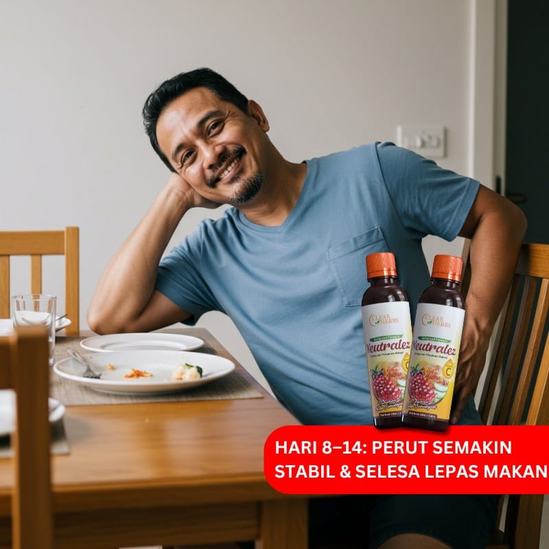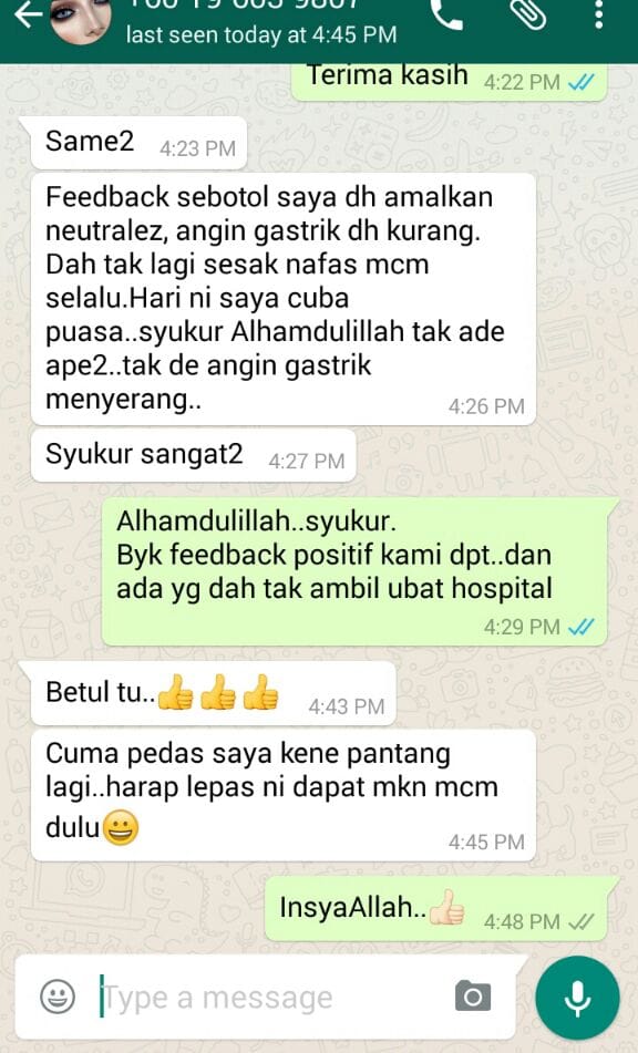 “Feedback sebotol saya dah amalkan Neutralez, angin gastrik dah kurang. Dah tak lagi sesak nafas macam selalu. Hari ni saya cuba puasa, syukur Alhamdulillah tak ada apa-apa, takde angin gastrik menyerang. Syukur sangat-sangat.”