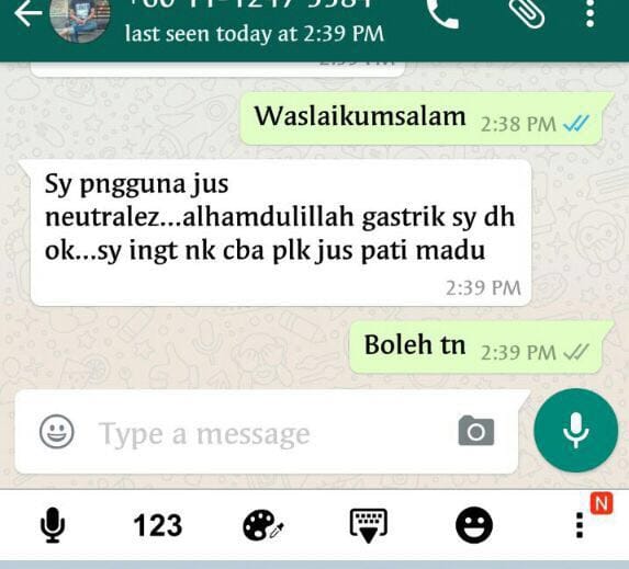 “Saya pengguna jus Neutralez… Alhamdulillah gastrik saya dah ok. Saya ingat nak cuba pula jus pati madu.”